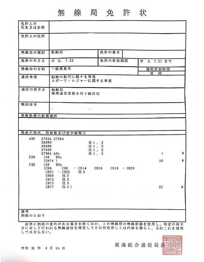 2019年7月1日 特定船舶無線局免許状更新