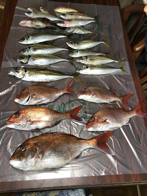 真鯛、大アジ、ハタ、イトヨリ、カイワリ、サバ・・・6目釣りで、気分転換になりました。でも足腰は痛いです。(笑)