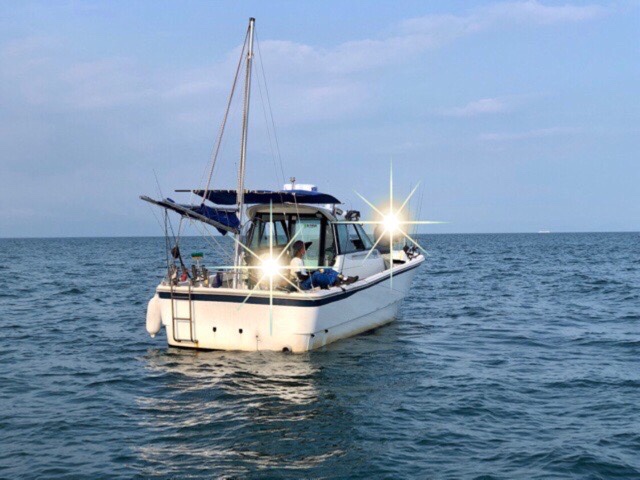 ところで夜釣りのほうですが、名人船はルアー???で流し釣りとか。私はヘッポコアングラーなので餌のサンマにアンカー釣りです。いつもの場所にアンカーしてやってみました。