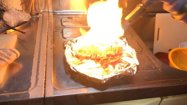 バーナーで炙っているところです。少し厚く切りすぎたのと炙り過ぎてしまい、味がとんでしまいました。失敗