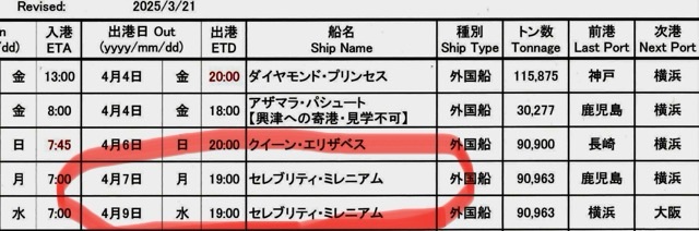 清水港の予定は↑のような感じで大型豪華客船が毎週のように来ているみたいです。