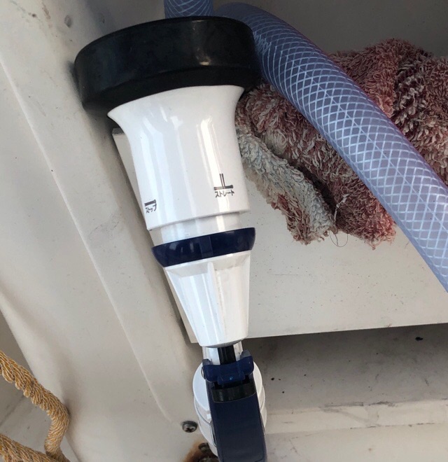 夕方、エンチョーに行ってデッキウォッシュとホースを買って、船に取り付けて来ました。