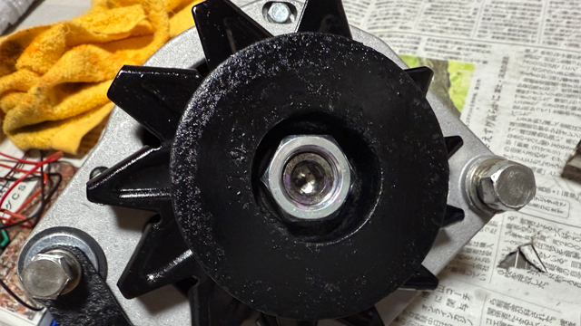 ファンとプーリーを黒色塗装して組み込んでみました。やっぱり短い。スプリングワッシャー抜いてナットかけてるんですが、ナットの2/3しか食ってません。これじゃしょうがないし危険なのでシヨップに交換を頼んだら、、、、、、、、、、、、、、、、、、、ご想像にお任せします。
